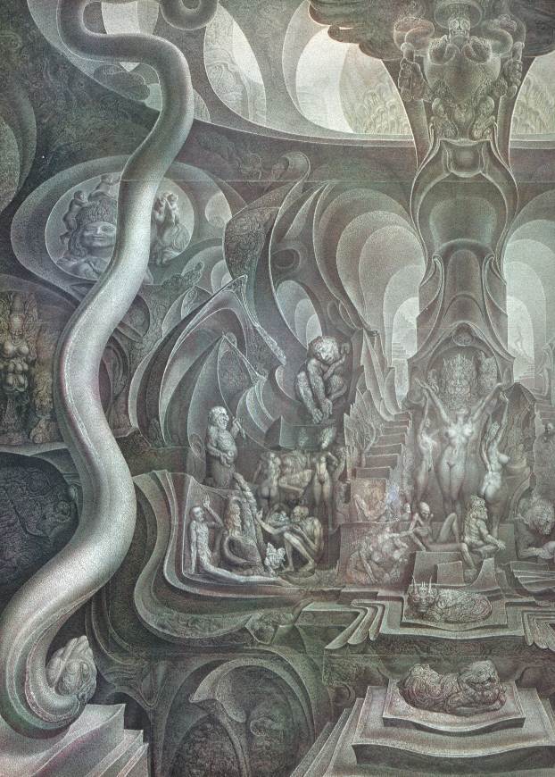 Diese "flüssigen Architekturen" findet man in vielen Bildern Ernst Fuchs. Besonders schön kommt es in dem Bild "Hiob und das Urteil des Paris" zum Vorschein und man erkennt sofort die offensichtliche Verwandtschaft zu der Architektur des Jugendstils und besonders der Gaudis und Rudolf Steiners. Interessant ist hier, dass Fuchs, als er einen Bildband mit Abbildungen des Goetheaniums Steiners zu sehen bekam, feststellen musste, dass diese Architektur der in seinen Bildern dargestellten bis aufs Haar ähnelten, obwohl er sie vorher nie gekannt hatte. Auch hier sieht man wieder, dass diese Urbilder "Archetypen sind, die aus der Tiefe der menschlichen Seele kommen und allen Menschen gemein sind.